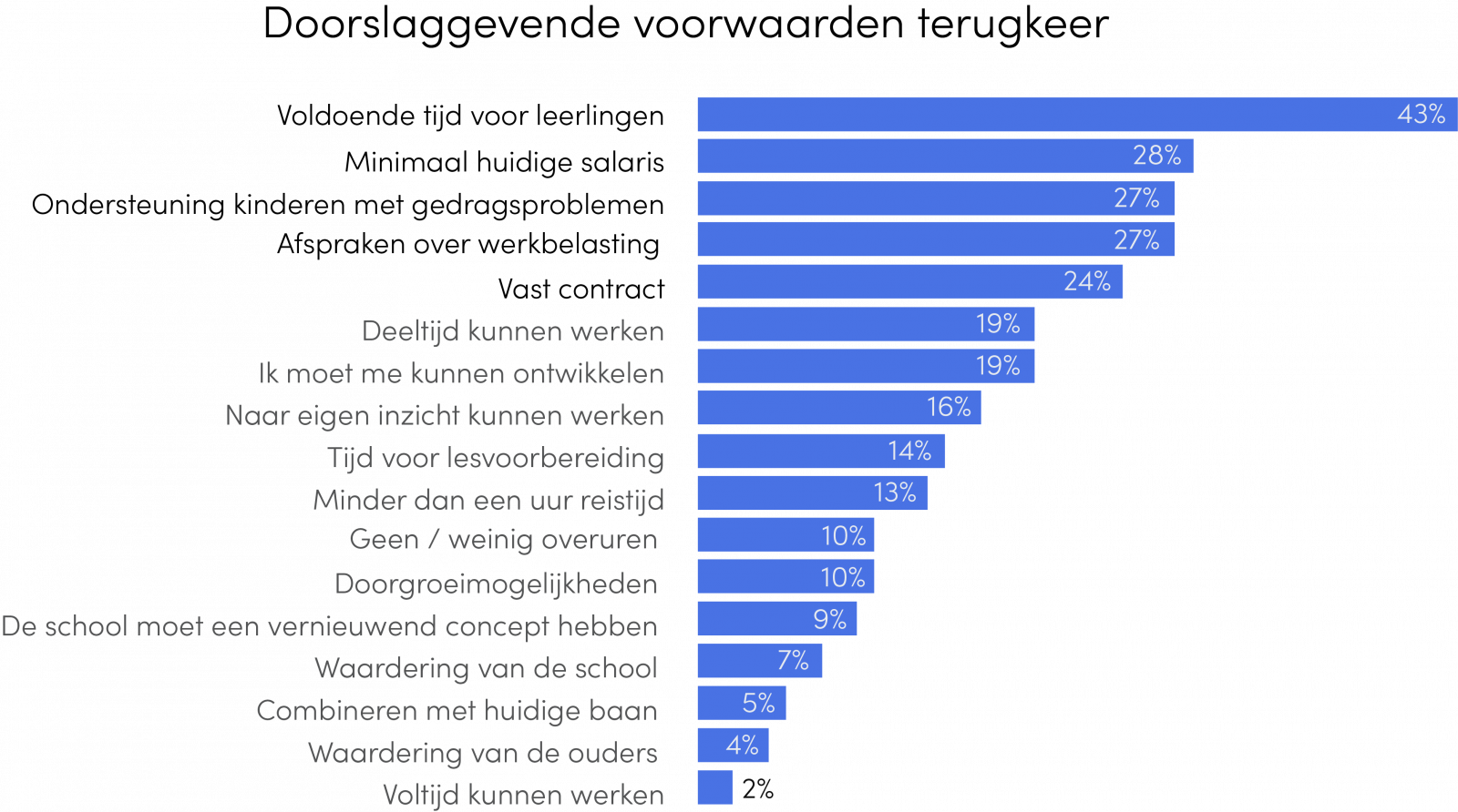 Afgelopen 5 oktober, op de nationale stakingsdag van onderwijzers, presenteerden we de belangrijkste resultaten uit de enquête. Mobilisatie van vertrokken onderwijzers is geen onmogelijke opdracht, bleek daaruit. Een ruime meerderheid van de stille reserve zou ‘misschien’ (45 procent) of ‘zeker’ (19 procent) willen terugkeren, zij het onder voorwaarden. Meer salaris is daarbij belangrijk, maar niet de meest urgente kwestie. Dat is de wens om voldoende tijd te kunnen besteden aan de leerlingen.